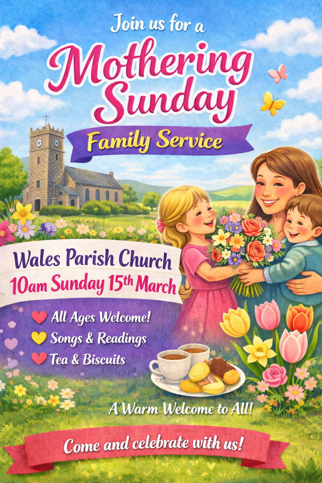 Posted on March 11, 2026March 11, 2026 by Wales Parish ChurchMothering Sunday Join us for the Mothering Sunday family service. Wales Parish Church10am – Sunday 15th March Click on the poster below for more details. Share this: Share on X (Opens in new window) X Share on Facebook (Opens in new window) Facebook Like Loading...